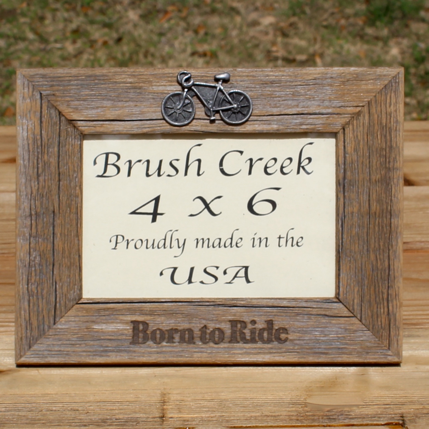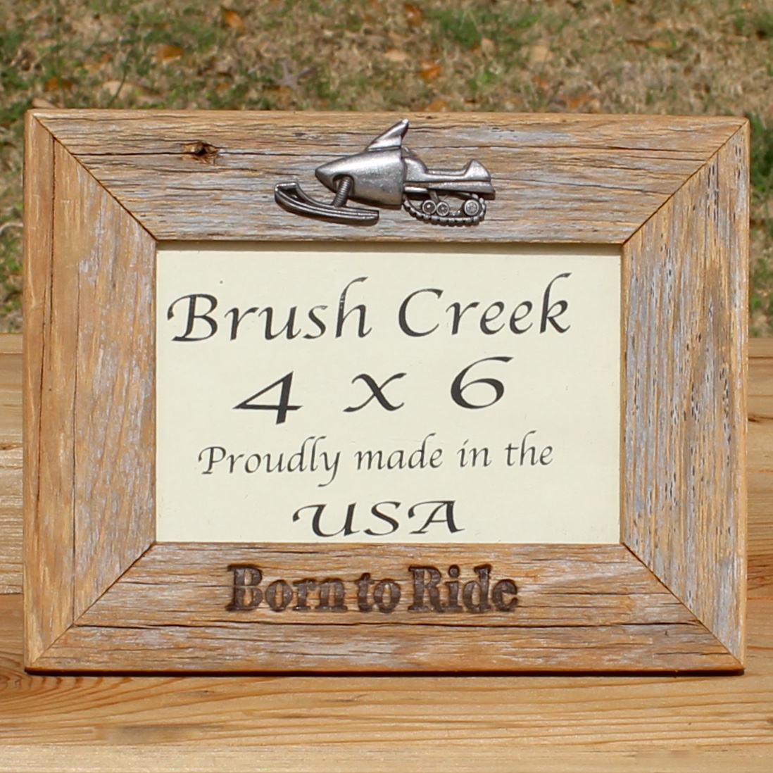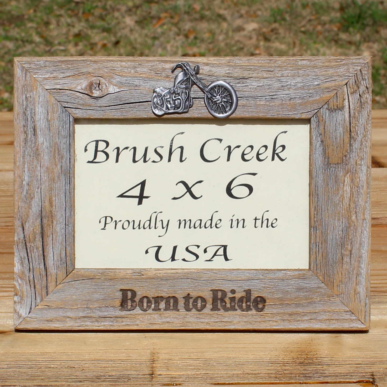 This branded picture frame has Born To Ride branded bottom center. It can have a (rusty or pewter) motorcycle ,pewter bicycle or pewter snowboarder glued on it. All our products are made from reclaimed wood sourced in the heart of Texas and handcrafted in Pipe Creek, Texas. Email us about custom orders.